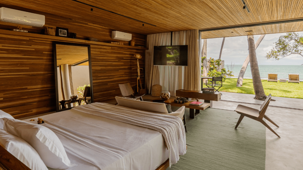 O hotel Campo Bahia é um complexo de 14 villas, cada uma com quatro suítes, sala de estar, cozinha e varanda. As villas são decoradas com obras de arte e móveis de design, criando um ambiente sofisticado e aconchegante. Além disso, elas são rodeadas por um belo jardim tropical.