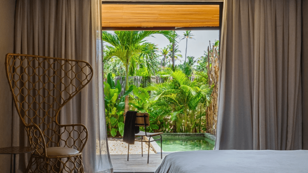 O hotel Campo Bahia é um complexo de 14 villas, cada uma com quatro suítes, sala de estar, cozinha e varanda. As villas são decoradas com obras de arte e móveis de design, criando um ambiente sofisticado e aconchegante. Além disso, elas são rodeadas por um belo jardim tropical.