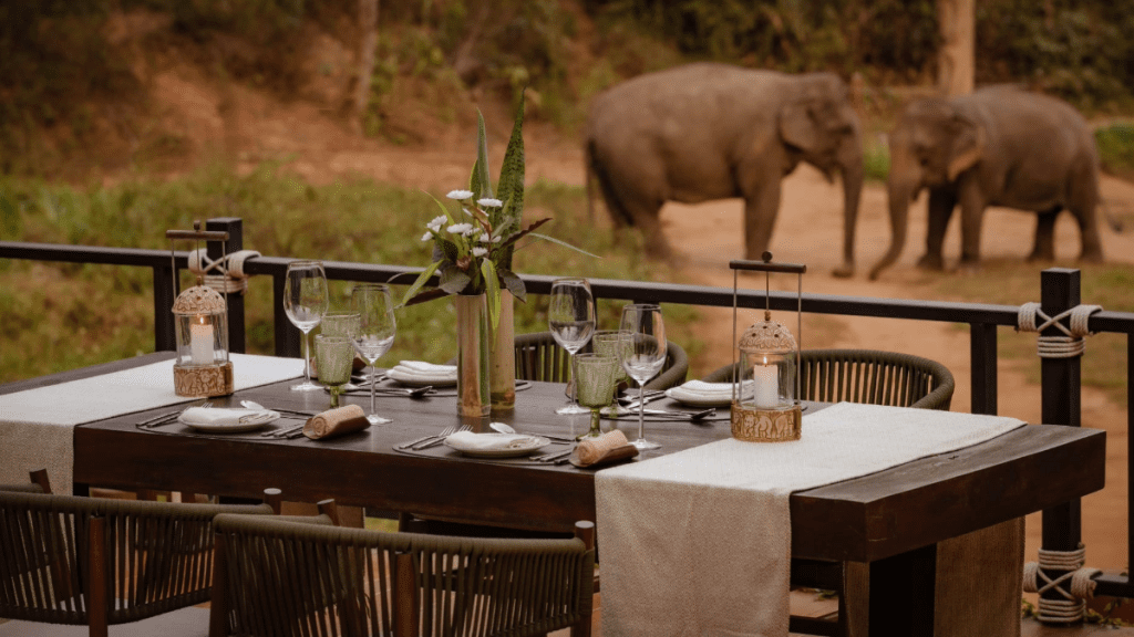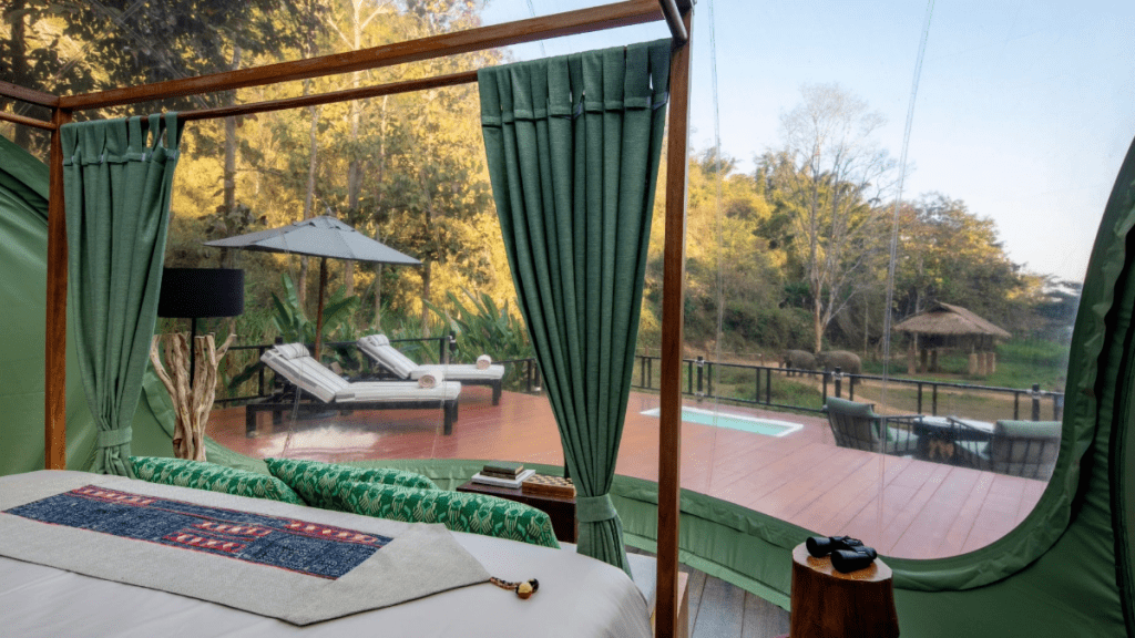 Os hóspedes podem observar e interagir com os elefantes de maneira ética e segura, sem exploração. Esta experiência está ligada ao trabalho da Golden Triangle Asian Elephant Foundation, que resgata elefantes de situações de abuso e tráfico ilegal, proporcionando-lhes um ambiente seguro e natural.